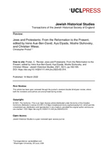 Title: | Review: Jews and Protestants: From the Reformation to the Present, edited by Irene Aue-Ben-David, Aya Elyada, Moshe Sluhovsky, and Christian Wiese |