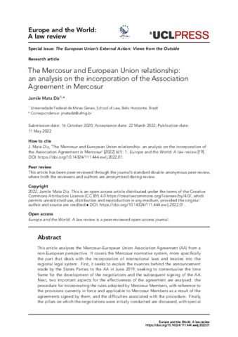 This article analyses the Mercosur–European Union Association Agreement (AA) from a non-European perspective. It covers the Mercosur normative system, more specifically the part that deals with the incorporation of international laws and treaties into the regional legal system. First, it seeks to explain the nuances behind the announcement made by the States Parties to the AA in June 2019, seeking to contextualise the time frame for the development of the negotiations and the subsequent signing of the AA. Next, two important aspects for the effectiveness of the agreement are analysed: the procedure for incorporating the rules adopted by Mercosur Members, with reference to the provisions currently in force and applicable to Mercosur Members as a result of the agreements signed by them; and the difficulties associated with the procedure. Finally, the pillars on which the negotiations were initially conducted are discussed, with special attention to political dialogue, trade and cooperation, and the sustainable development considerations that are present in the AA. By adopting a non-European perspective, this article presents the issues related to Mercosur’s internal normative system for the incorporation of international norms and regulations, that is, the agreement itself, and the procedure for its entry into force and possible obstacles to its implementation. It is concluded that, despite all the efforts made to finalise the negotiations, there is a clear and indisputable uncertainty regarding the effective application of the agreement.