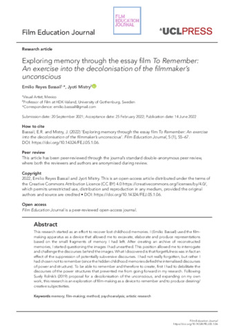 Title: | Exploring memory through the essay film To Remember: An exercise into the decolonisation of the filmmaker’s unconscious |