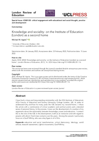 Additional information: | © 2022, Michael W. Apple. This is an open-access article distributed under the terms of the Creative Commons Attribution Licence (CC BY) 4.0 https://creativecommons.org/licenses/by/4.0/, which permits unrestricted use, distribution and reproduction in any medium, provided the original author and source are credited. |