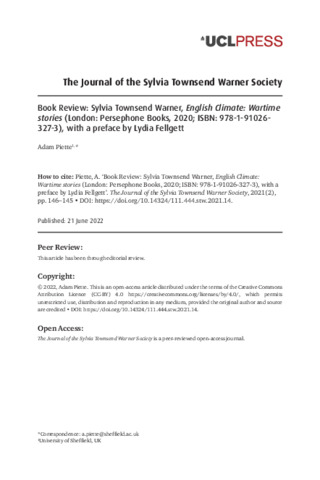 Title: | Book Review: Sylvia Townsend Warner, English Climate: Wartime stories (London: Persephone Books, 2020; ISBN: 978-1-91026-327-3), with a preface by Lydia Fellgett |