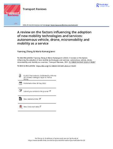 Title: | A review on the factors influencing the adoption of new mobility technologies and services: autonomous vehicle, drone, micromobility and mobility as a service |