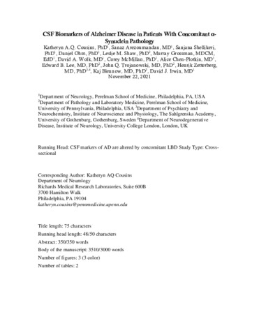 Title: | CSF Biomarkers of Alzheimer Disease in Patients With Concomitant α-Synuclein Pathology |