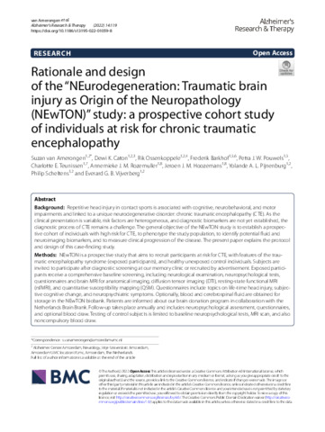 Title: | Rationale and design of the "NEurodegeneration: Traumatic brain injury as Origin of the Neuropathology (NEwTON)" study: a prospective cohort study of individuals at risk for chronic traumatic encephalopathy |