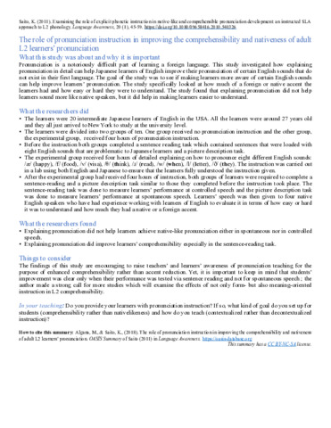 | Title: | The role of pronunciation instruction in improving the comprehensibility and nativeness of adult L2 learners’ pronunciation (OASIS Summary) |