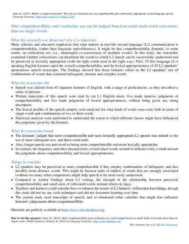 | Title: | Oral comprehensibility and vocabulary use can be judged based on small multi-word units more than on single words (OASIS Summary) |