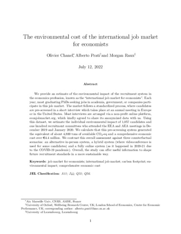 We provide an estimate of the environmental impact of the recruitment system in the economics profession, known as the “international job market for economists”. Each year, most graduating PhDs seeking jobs in academia, government, or companies participate in this job market. The market follows a standardized process, where candidates are pre-screened in a short interview which takes place at an annual meeting in Europe or in the United States. Most interviews are arranged via a non-profit online platform, econjobmarket.org, which kindly agreed to share its anonymized data with us. Using this dataset, we estimate the individual environmental impact of 1057 candidates and one hundred recruitment committees who attended the EEA and AEA meetings in December 2019 and January 2020. We calculate that this pre-screening system generated the equivalent of about 4800 tons of avoidable CO2-eq and a comprehensive economic cost over €4.4 million. We contrast this overall assessment against three counterfactual scenarios: an alternative in-person system, a hybrid system (where videoconference is used for some candidates) and a fully online system (as it happened in 2020–21 due to the COVID-19 pandemic). Overall, the study can offer useful information to shape future recruitment standards in a more sustainable way.