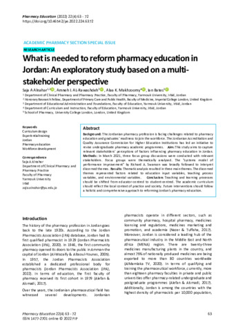 Title: | What is needed to reform pharmacy education in Jordan: An exploratory study based on a multi-stakeholder perspective |