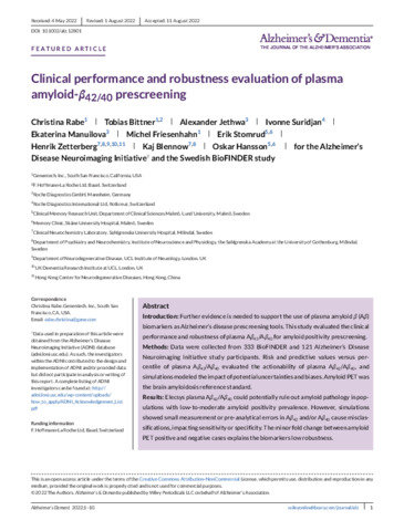 Title: | Clinical performance and robustness evaluation of plasma amyloid-β42/40 prescreening |