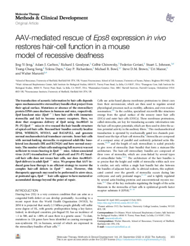 AAV-mediated rescue of Eps8 expression in vivo restores hair-cell function in a mouse model of recessive deafness.
