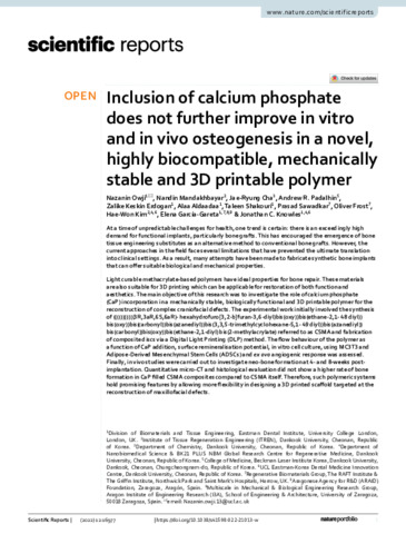 | Title: | Inclusion of calcium phosphate does not further improve in vitro and in vivo osteogenesis in a novel, highly biocompatible, mechanically stable and 3D printable polymer |