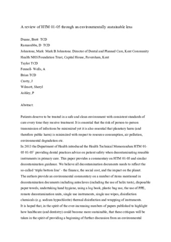 Patients deserve to be treated in a safe and clean environment with consistent standards of care every time they receive treatment. It is essential that the risk of person-to-person transmission of infections be minimised, yet it is also essential that planetary harm (and therefore public harm) is minimised with respect to resource consumption, air pollution, environmental degradation etc.In 2013, the Department of Health introduced the Health Technical Memorandum (HTM) 01-05 providing dental practices with advice on patient safety when decontaminating reusable instruments in primary care. This paper provides a commentary on HTM 01-05 and similar decontamination guidance. We believe all decontamination documents needs to reflect the so-called 'triple bottom line' - the finance, social cost and impact on the planet.The authors provide an environmental commentary on a number of items mentioned in decontamination documents, including autoclaves (including the use of helix tests), disposable paper towels, undertaking hand hygiene, using a log book, plastic bag use, the use of personal protective equipment, remote decontamination units, single use instruments, single use wipes, disinfection chemicals (for example, sodium hypochlorite) thermal disinfection and wrapping of instruments.It is hoped, in the spirit of the ever-increasing numbers of papers published to highlight how healthcare (and dentistry) could become more sustainable, that these critiques will be taken in the spirit of providing a beginning of further discussion from an environmental perspective.