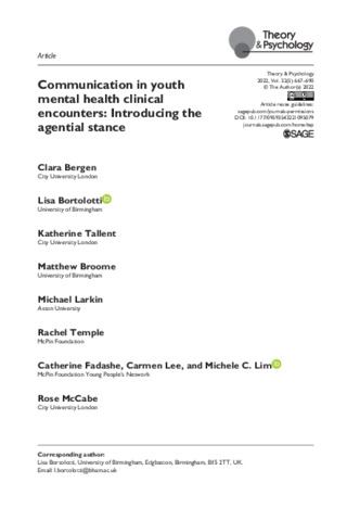 Title: | Communication in youth mental health clinical encounters: Introducing the agential stance |