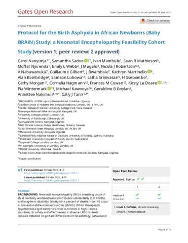 | Title: | Protocol for the Birth Asphyxia in African Newborns (Baby BRAiN) Study: A Neonatal Encephalopathy Feasibility Cohort Study |