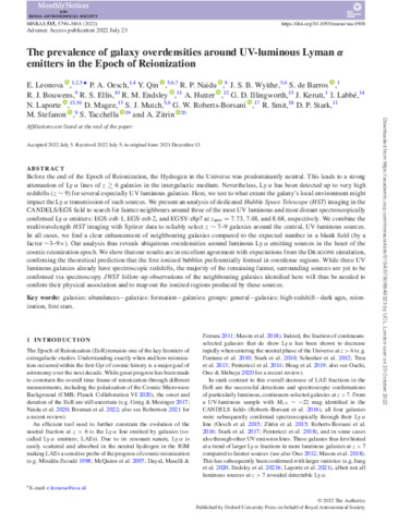 Title: | The prevalence of galaxy over densities around UV-luminous Lyman emitters in the Epoch of Reionization |