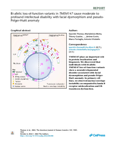 Title: | Bi-allelic loss-of-function variants in TMEM147 cause moderate to profound intellectual disability with facial dysmorphism and pseudo-Pelger-Huët anomaly |
