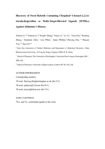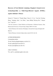 Title: | Discovery of novel hybrids containing clioquinol−1-benzyl-1,2,3,6-tetrahydropyridine as multi-target-directed ligands (MTDLs) against Alzheimer's disease |