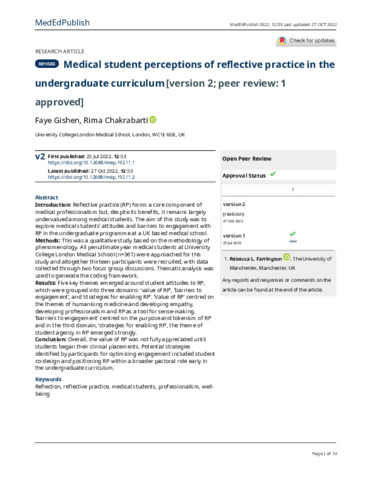 | Title: | Medical student perceptions of reflective practice in the undergraduate curriculum [version 2; peer review: 1 approved] |