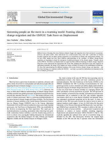 Different ways of framing the nexus between climate change and migration have been advanced in academic, advocacy and policy circles. Some understand it as a state-security issue, some take a protection (or human security) approach and yet others portray migration as an adaptation or climate risk management strategy. Yet we have little insight into how these different understandings of the ‘problem’ of climate change-related migration are beginning to shape the emergence of global governance in the climate regime. Through a focus on the UNFCCC Task Force on Displacement we argue that these different framings of climate change migration shape how actors understand the appropriate role of the TFD, including the substantive scope of its mandate; its operational priorities; the nature of its outputs and where it should be situated in the institutional architecture. We show that understanding the different framings of the nexus between climate change and migration – and how these framings are contested within the UNFCCC – can help to account for institutional development in this area of climate governance.