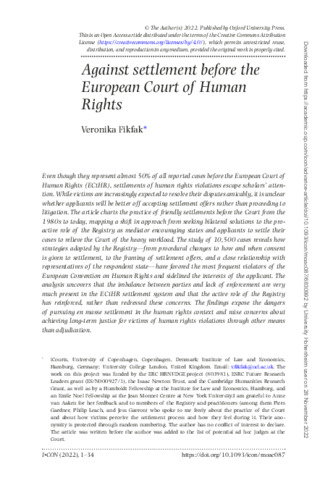 Even though they represent almost 50% of all reported cases before the European Court of Human Rights (ECtHR), settlements of human rights violations escape scholars’ attention. While victims are increasingly expected to resolve their disputes amicably, it is unclear whether applicants will be better off accepting settlement offers rather than proceeding to litigation. The article charts the practice of friendly settlements before the Court from the 1980s to today, mapping a shift in approach from seeking bilateral solutions to the proactive role of the Registry as mediator encouraging states and applicants to settle their cases to relieve the Court of the heavy workload. The study of 10,500 cases reveals how strategies adopted by the Registry—from procedural changes to how and when consent is given to settlement, to the framing of settlement offers, and a close relationship with representatives of the respondent state—have favored the most frequent violators of the European Convention on Human Rights and sidelined the interests of the applicant. The analysis uncovers that the imbalance between parties and lack of enforcement are very much present in the ECtHR settlement system and that the active role of the Registry has reinforced, rather than redressed these concerns. The findings expose the dangers of pursuing en masse settlement in the human rights context and raise concerns about achieving long-term justice for victims of human rights violations through other means than adjudication.