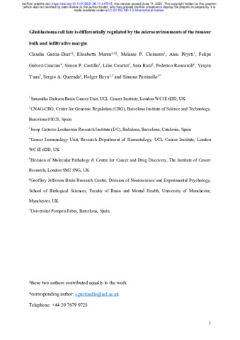 Glioblastoma cell fate is differentially regulated by the microenvironments of the tumour bulk and infiltrative margin.