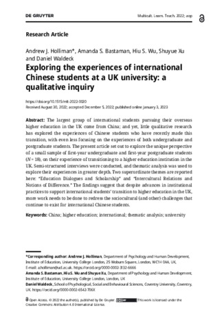 | Title: | Exploring the experiences of international Chinese students at a UK university: A qualitative inquiry |
