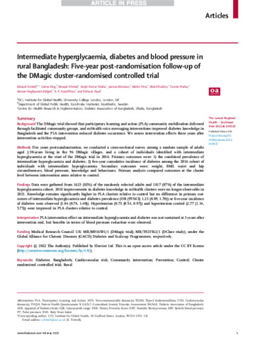 Title: | Intermediate hyperglycaemia, diabetes and blood pressure in rural Bangladesh: Five-year post-randomisation follow-up of the DMagic cluster-randomised controlled trial |