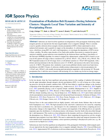 Title: | Examination of Radiation Belt Dynamics during Substorm Clusters: Magnetic Local Time Variation and Intensity of Precipitating Fluxes |
