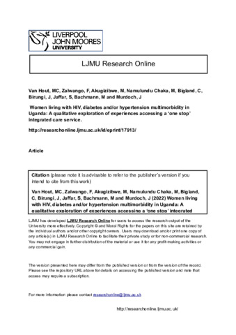 Title: | Women living with HIV, diabetes and/or hypertension multi-morbidity in Uganda: a qualitative exploration of experiences accessing an integrated care service |
