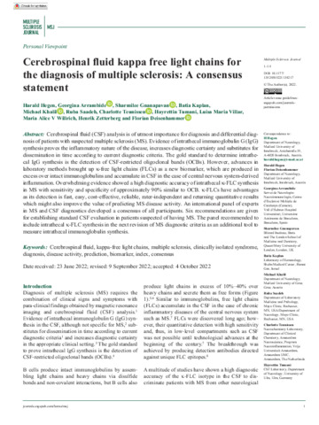 Title: | Cerebrospinal fluid kappa free light chains for the diagnosis of multiple sclerosis: A consensus statement |