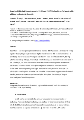 Title: | Yeast Sec14-like lipid transfer proteins Pdr16 and Pdr17 bind and transfer the ergosterol precursor lanosterol in addition to phosphatidylinositol |