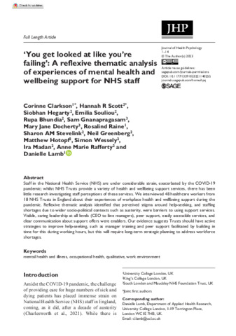 | Title: | 'You get looked at like you're failing': A reflexive thematic analysis of experiences of mental health and wellbeing support for NHS staff |