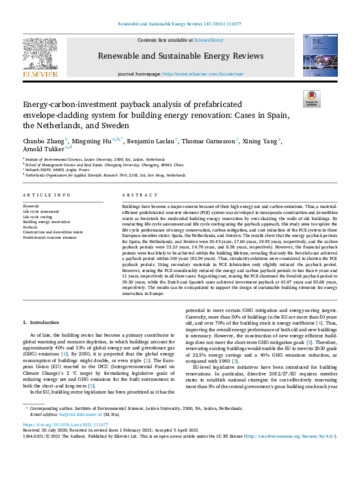 Energy-carbon-investment payback analysis of prefabricated envelope-cladding system for building energy renovation: Cases in Spain, the Netherlands, and Sweden.
