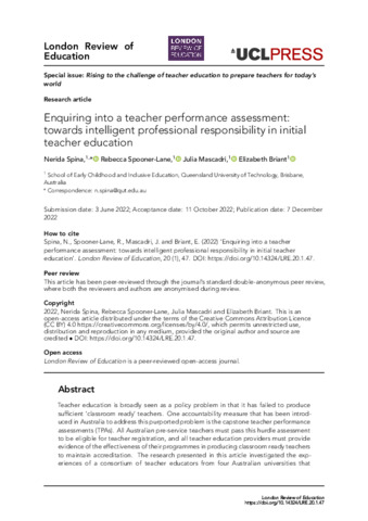 | Title: | Enquiring into a teacher performance assessment: towards intelligent professional responsibility in initial teacher education |