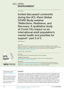 Invited discussant comments during the UCL–Penn Global COVID Study webinar ‘Reflections, Resilience, and Recovery: A qualitative study of Covid-19’s impact on an international adult population’s mental health and priorities for support’: part 3 of 3.