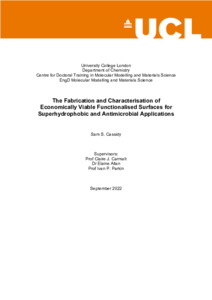 Title: | The Fabrication and Characterisation of Economically Viable Functionalised Surfaces for Superhydrophobic and Antimicrobial Applications |