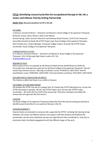 Title: | Identifying research priorities for occupational therapy in the UK: A James Lind Alliance Priority Setting Partnership |