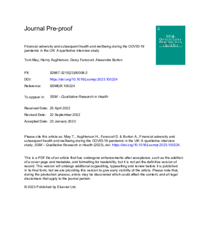 | Title: | Financial adversity and subsequent health and wellbeing during the COVID-19 pandemic in the UK: A qualitative interview study |