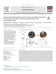 Exploring wettability difference-driven wetting by utilizing electrospun chimeric Janus microfiber comprising cellulose acetate and polyvinylpyrrolidone.