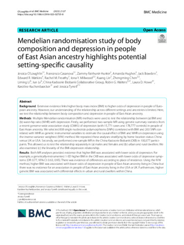 Keywords: | BMI, Depression, East Asian ancestry, Mendelian randomisation, Public health, Setting-specific causality, Sociocultural factors |
