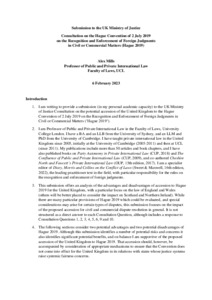 Title: | Submission to the UK Ministry of Justice Consultation on the Hague Convention of 2 July 2019 on the Recognition and Enforcement of Foreign Judgments in Civil or Commercial Matters |