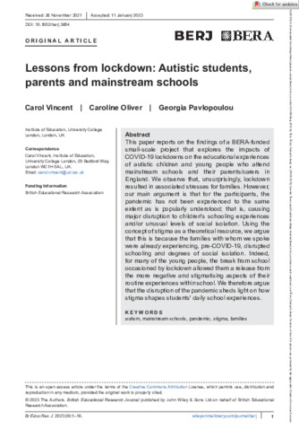 British Educational Res J - 2023 - Vincent - Lessons from lockdown Autistic students parents and mainstream schools.pdf - Published Version Download (270kB) | Preview |
