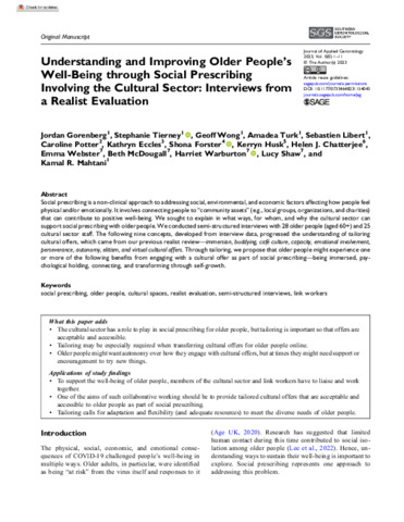 Title: | Understanding and Improving Older People's Well-Being through Social Prescribing Involving the Cultural Sector: Interviews from a Realist Evaluation |