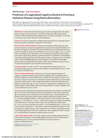 Prediction of Longitudinal Cognitive Decline in Preclinical Alzheimer Disease Using Plasma Biomarkers.
