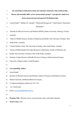 Title: | Do associations of physical activity and sedentary behaviour with cardiovascular disease and mortality differ across socioeconomic groups? A prospective analysis of device-measured and self-reported UK Biobank data |