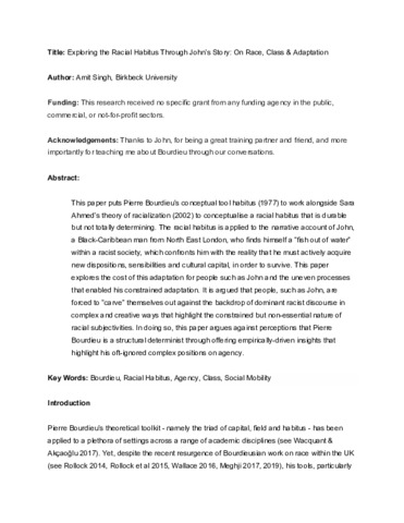 Title: | Exploring the racial habitus through John’s story: On race, class and adaptation |