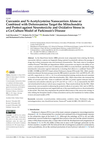 Title: | Curcumin and N-Acetylcysteine Nanocarriers Alone or Combined with Deferoxamine Target the Mitochondria and Protect against Neurotoxicity and Oxidative Stress in a Co-Culture Model of Parkinson’s Disease |