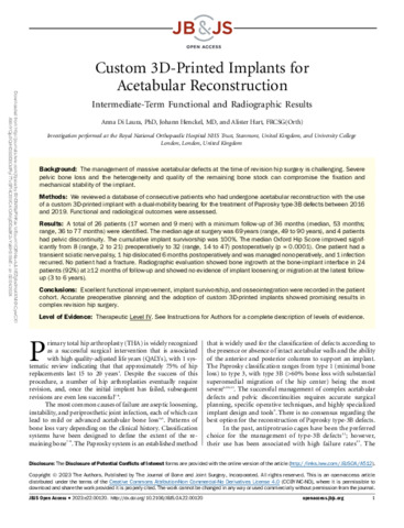 Title: | Custom 3D-Printed Implants for Acetabular Reconstruction: Intermediate-Term Functional and Radiographic Results |