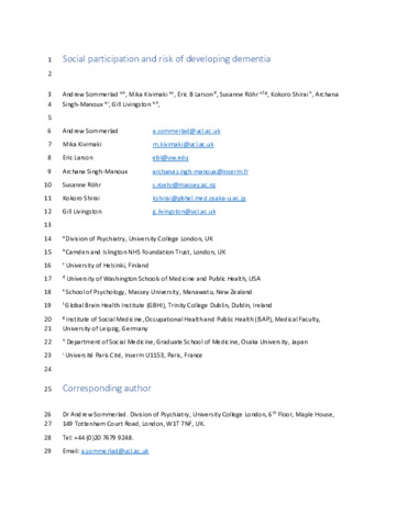 The increasing number of people with dementia globally illustrates the urgent need to reduce dementia’s scale and impact. Lifetime social participation may affect dementia risk by increasing cognitive reserve, and through brain maintenance by reducing stress and improving cerebrovascular health. It may therefore have important implications for individual behavior and public health policy aimed at reducing dementia burden. Observational study evidence indicates that greater social participation in midlife and late life is associated with 30–50% lower subsequent dementia risk, although some of this may not be causal. Social participation interventions have led to improved cognition but, partly due to short follow-up and small numbers of participants, no reduction in risk of dementia. We summarize the evidence linking social participation with dementia, discuss potential mechanisms by which social participation is likely to reduce and mitigate the impact of neuropathology in the brain, and consider the implications for future clinical and policy dementia prevention interventions.
