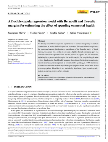 Title: | A flexible copula regression model with Bernoulli and Tweedie margins for estimating the effect of spending on mental health |
